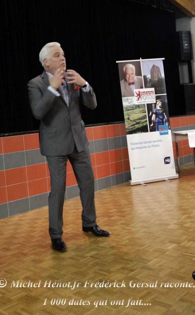 Chroniqueur historique sur les radios, à Télé matin Frédérick Gersal est venu raconter les histoires du Poitou à Charroux. L'homme au ''nœud pap et costume clair'' a soulevé l'enthousiasme de son auditoire durant plus de 1 heure 30sur les personnages du Poitou qui ont marqué l'Histoire. "C'est ainsi que nous aurions aimé que l'Histoire nous fut enseignée!" Diront les spectateurs. Il a également présenté son dernier ouvrage ''les 1 000 dates qui ont fait l'histoire de France! Il sera le 30 avril à Vouillé 86 et le 28 mai à Ligugé 86. plus de détails dans la presse...